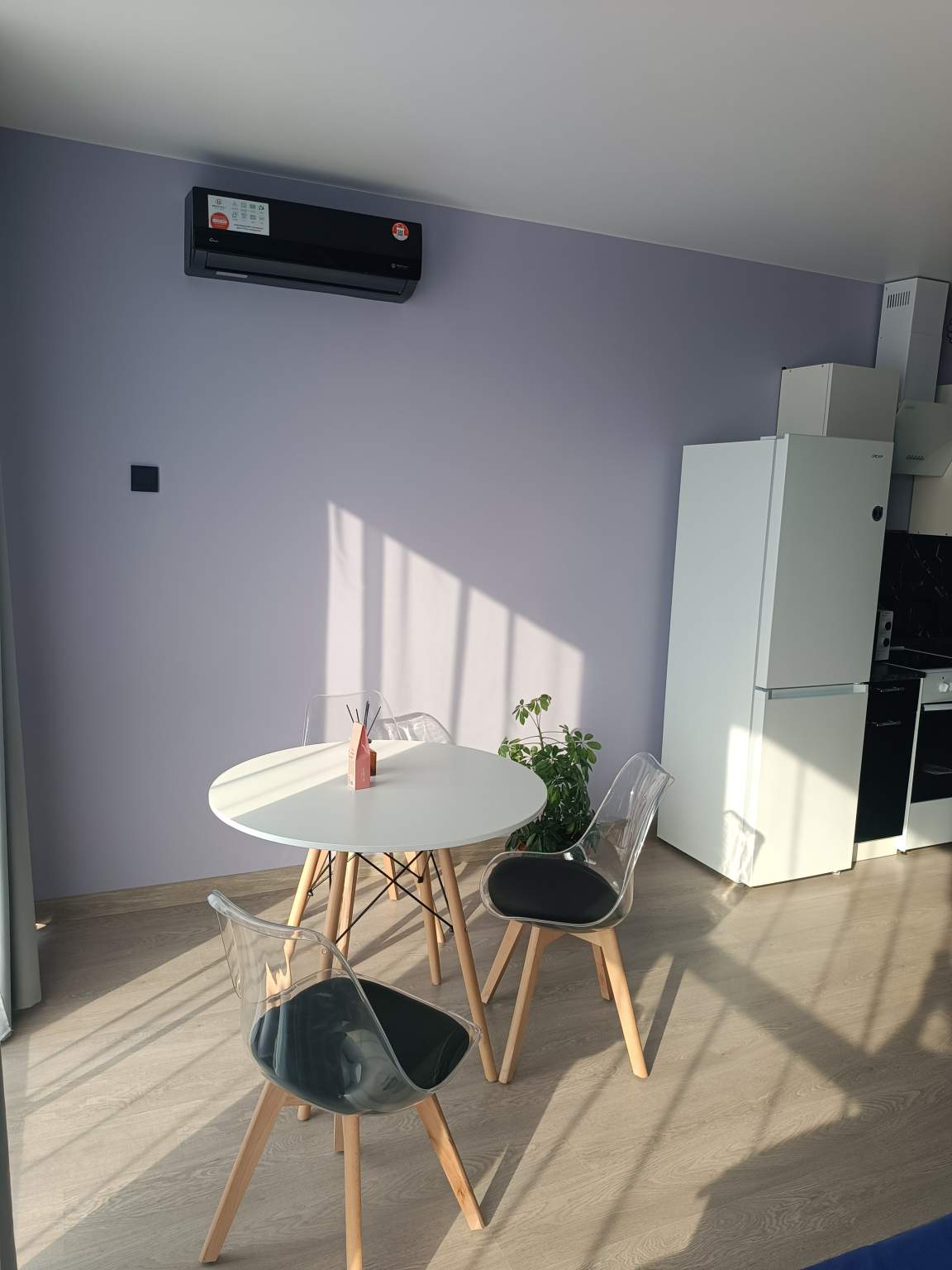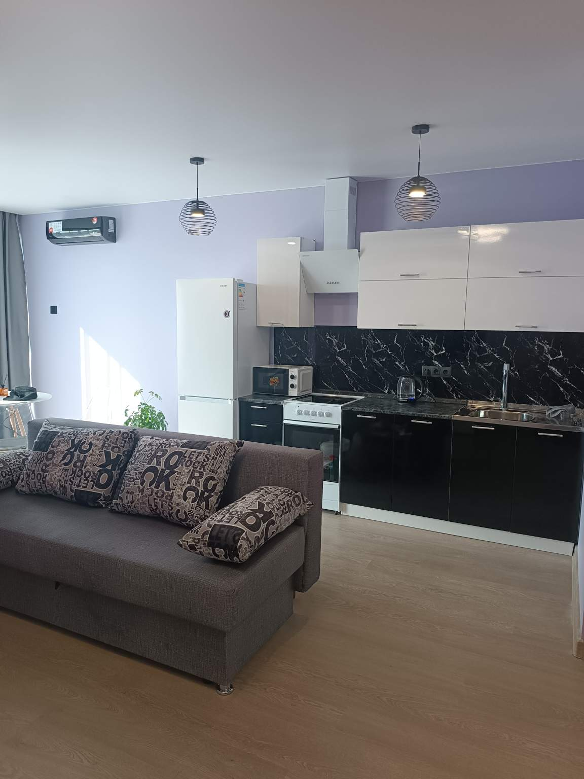 Жилая площадь 35.4 кв.м, внутри евро ремонт. Квартира с мебелью, есть бытовая техника: стиральная машина, холодильник, телевизор, кондиционер, микроволновая печь, интернет. Раздельных санузлов - нет.