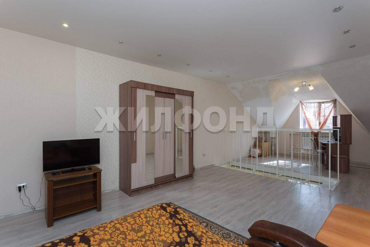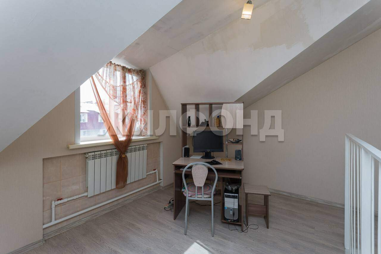 На втором уровне: открытое пространство для отдыха (34 кв. м) и зона рабочего кабинета у окна.