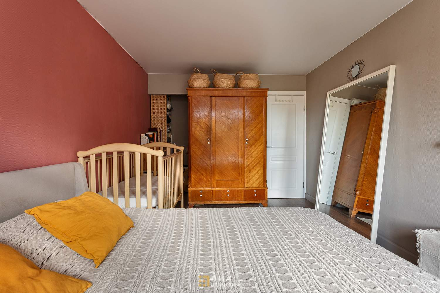 Спальня с спокойной атмосферой и местом под кровать и отдельной зоной для хранения- удобно и функционально.