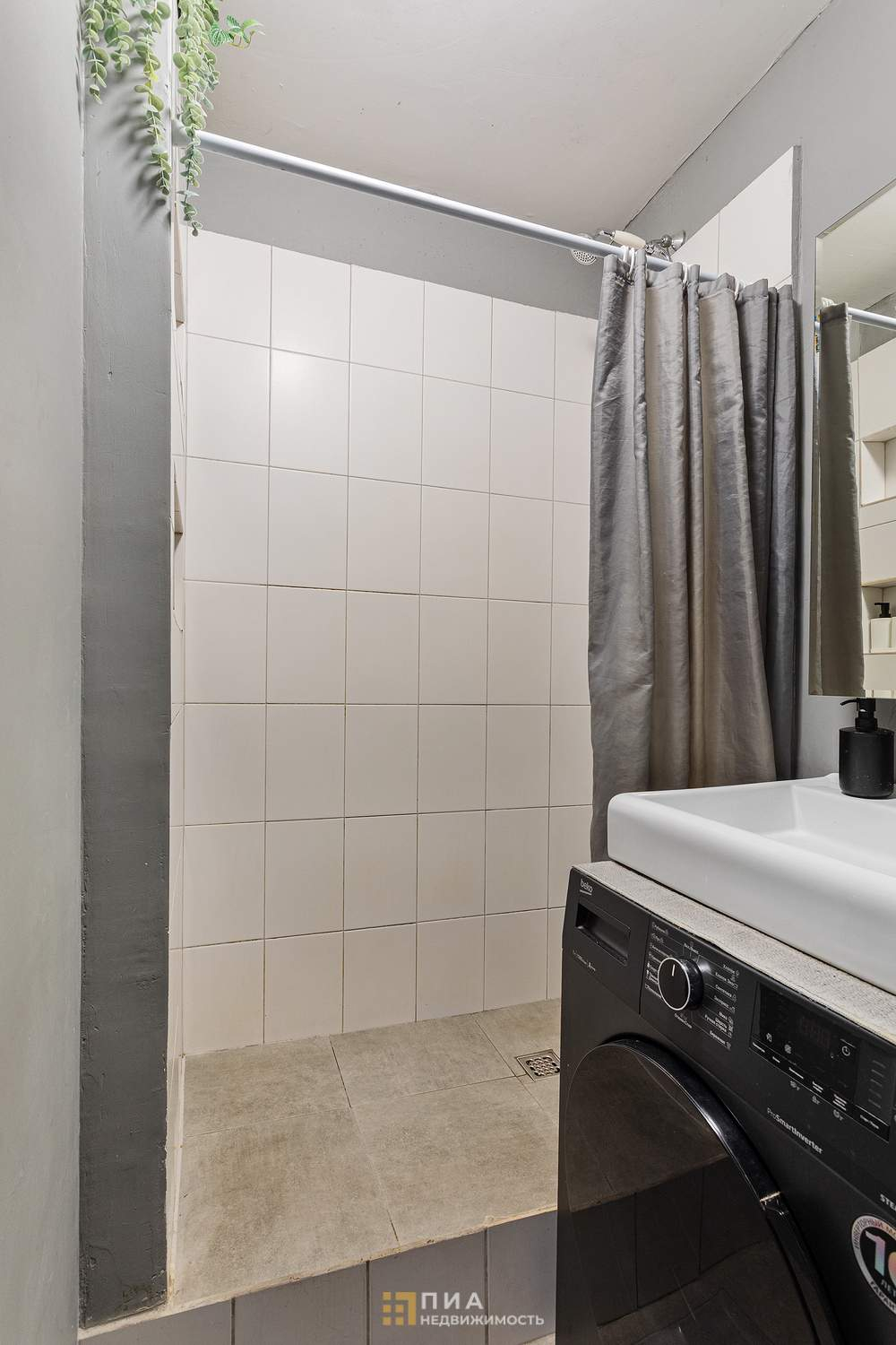 Полноценная ванная комната с душевой кабиной и стиральной машиной.