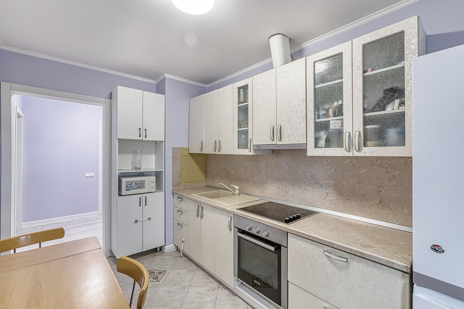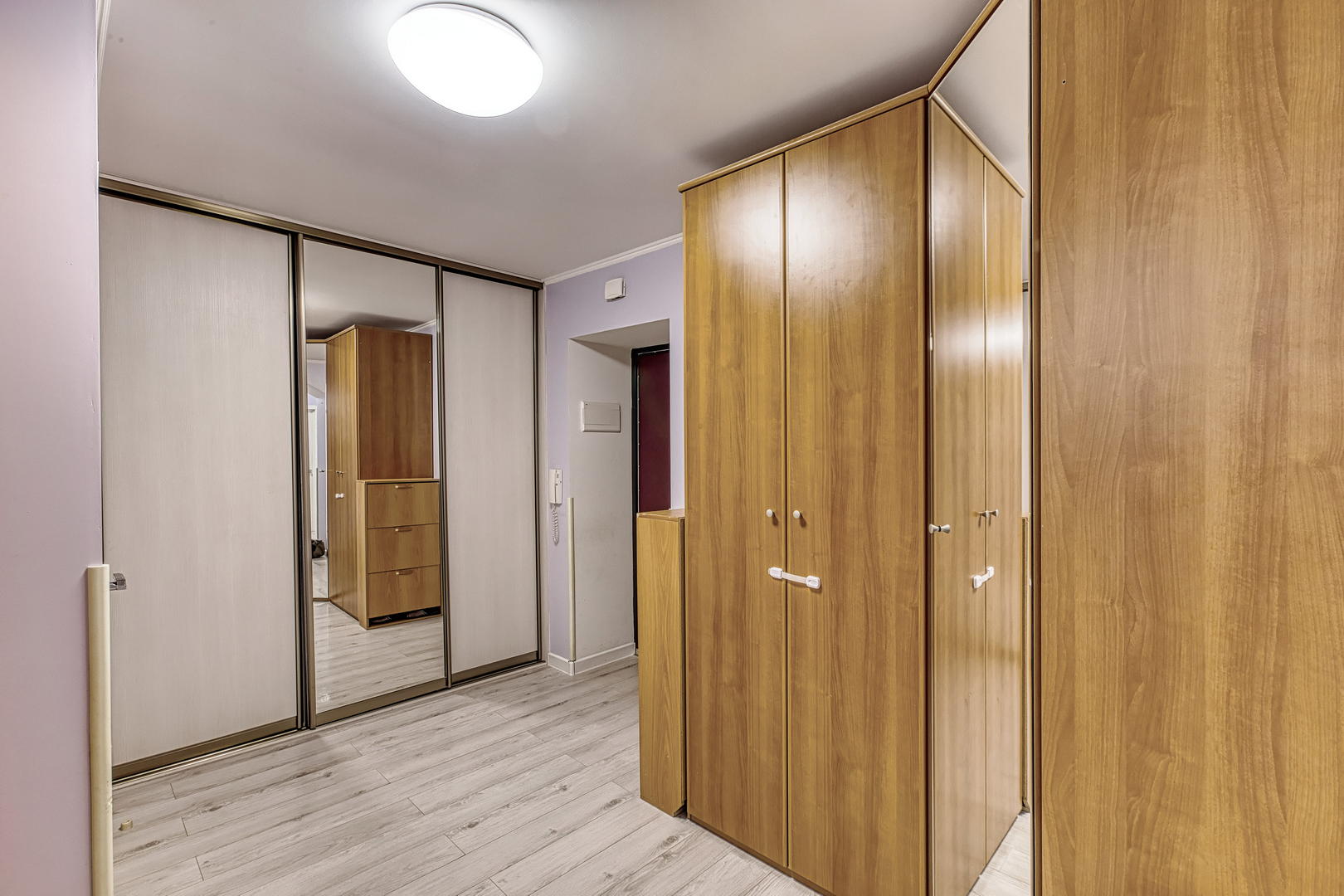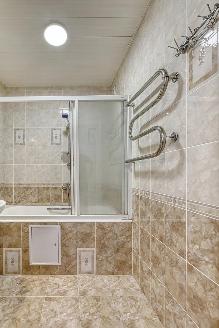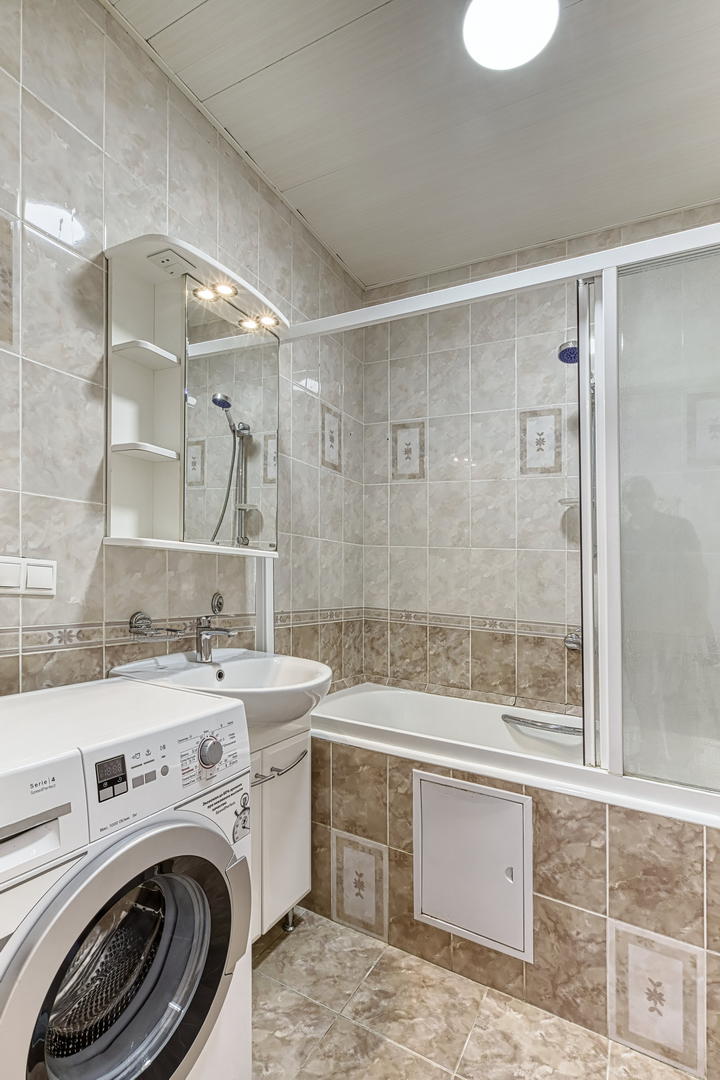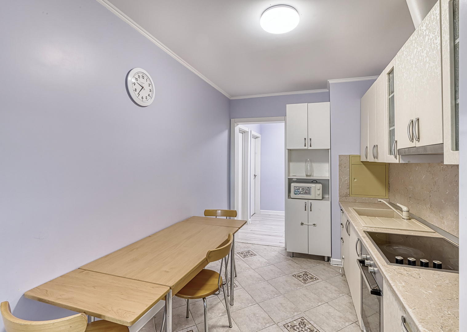 Квартира расположена на 9 этаже, две небольшие спальни, большая кухня и просторный хол, оборудованный шкафами для хранения. Кухонный гарнитур, шкафы в прихожей - остаются. Квартира в хорошем состоянии, косметический ремонт был сделан 2 года назад.