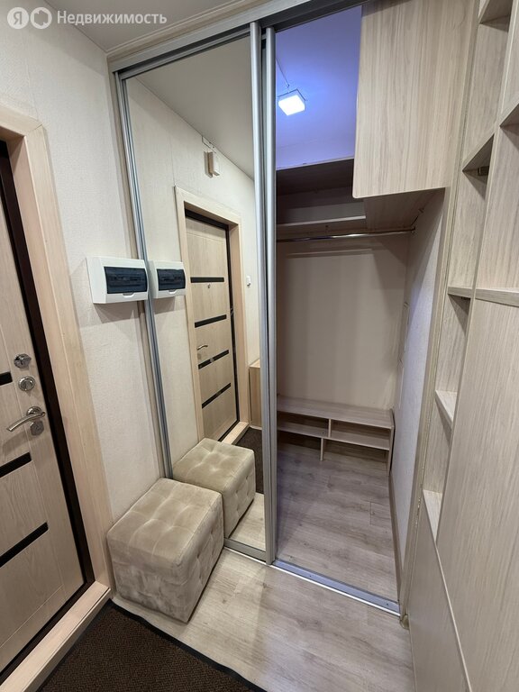 Гардероб с зеркальными дверями в прихожей с множеством полок для хранения вещей, одежды и обуви.