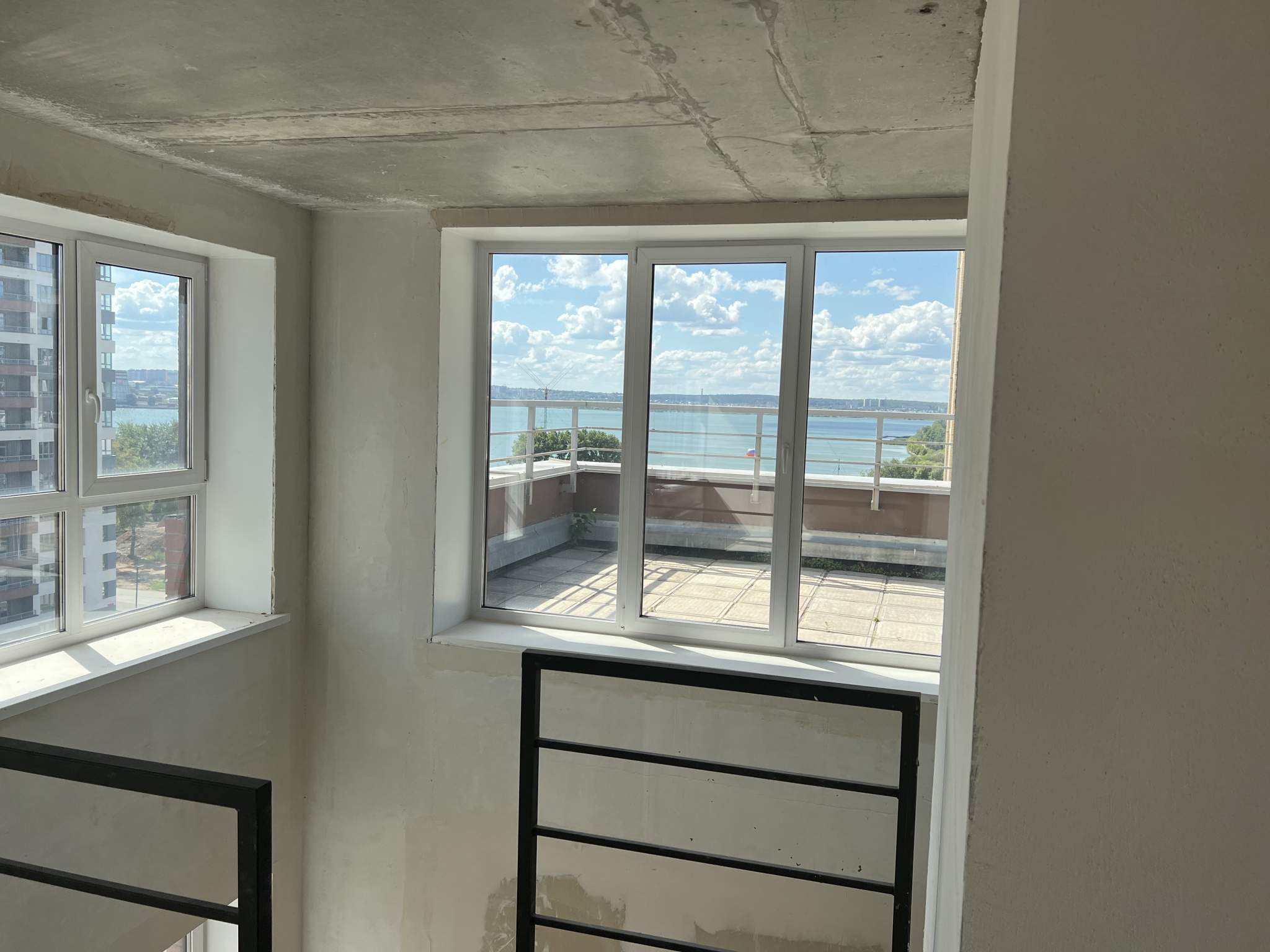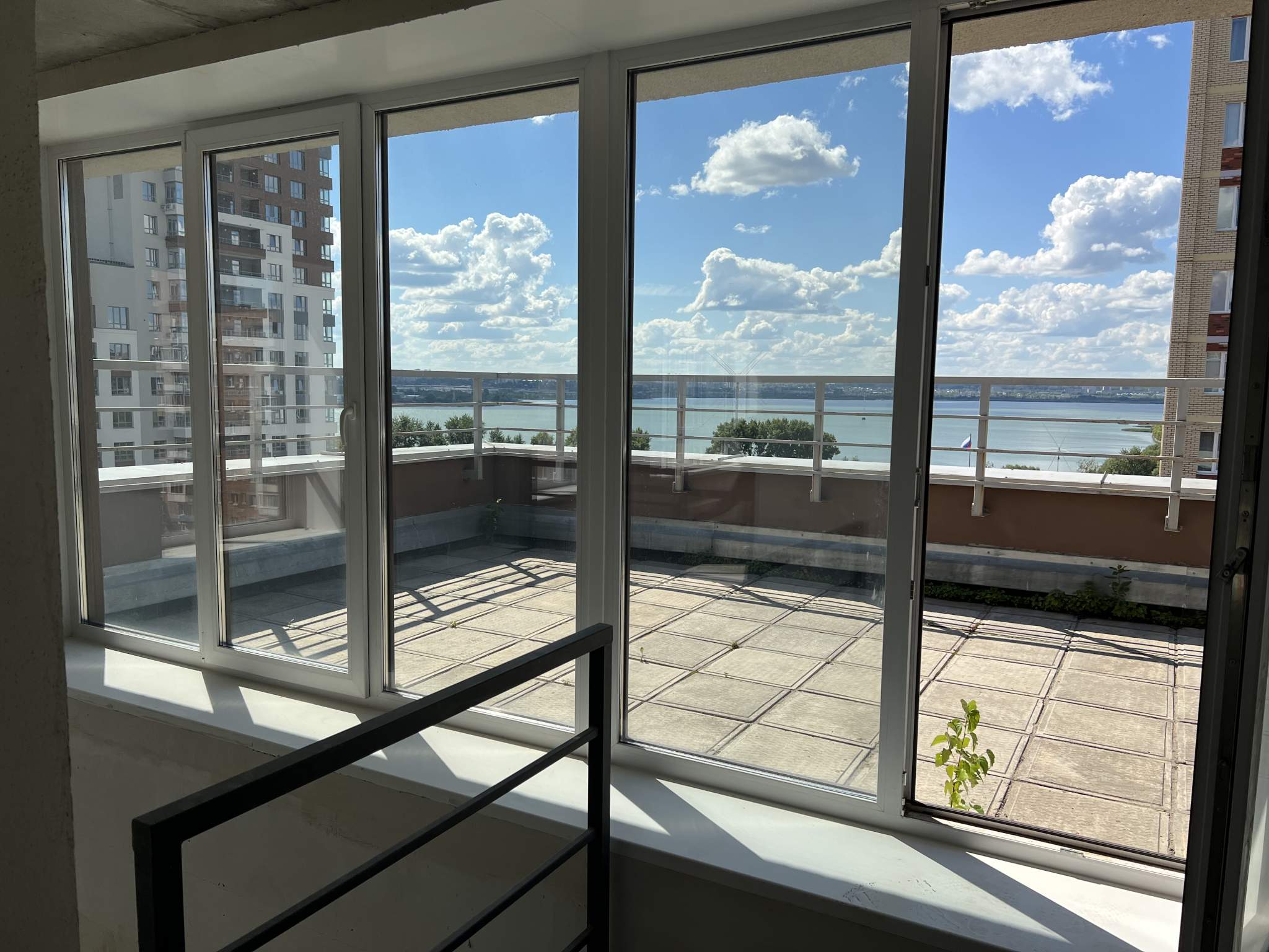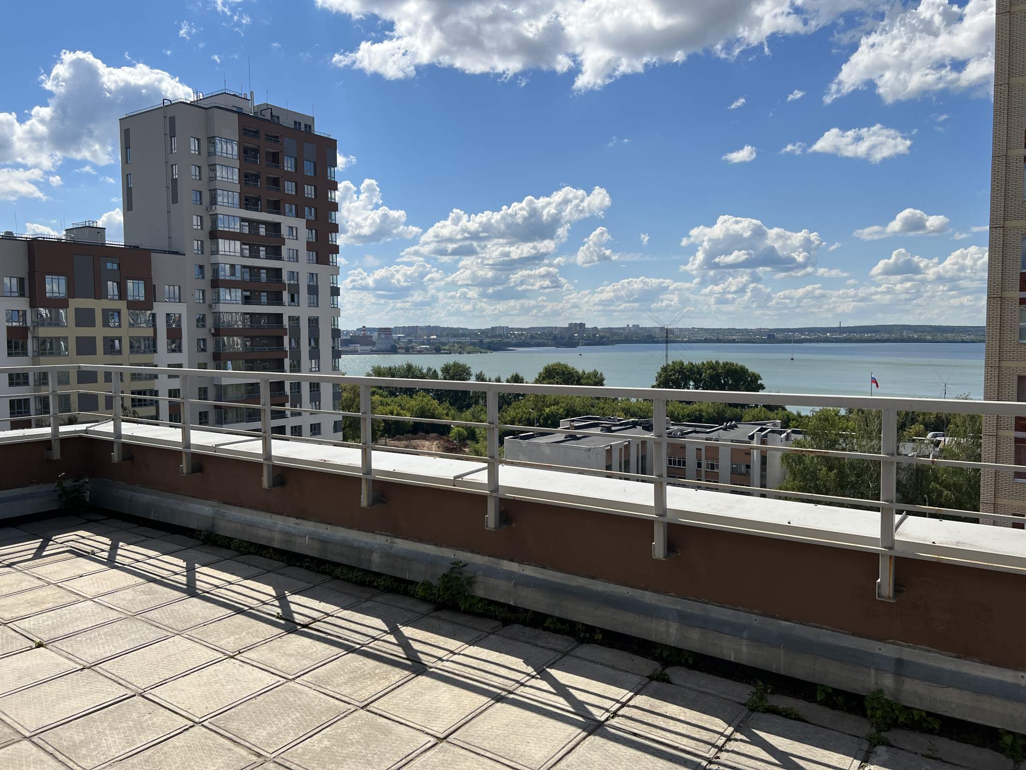 Жилая площадь 45 кв. м, кухня 27 кв. м. Раздельных санузлов - 2, совмещенных санузлов - 1, балконов - 1, окна выходят на пруд. Большая терраса с видом на пруд.