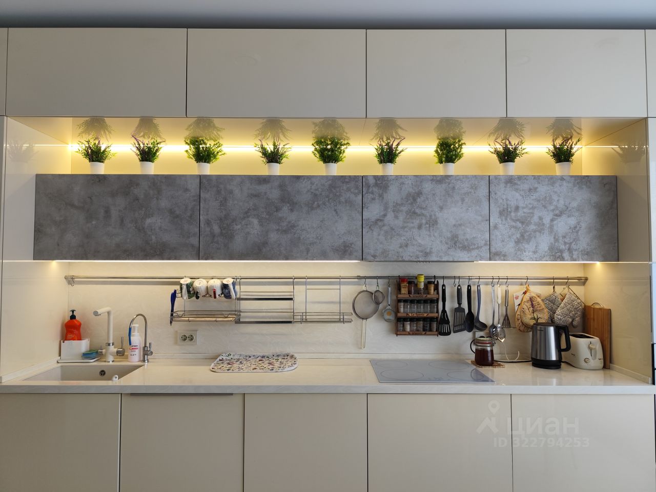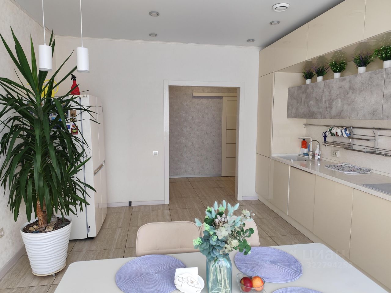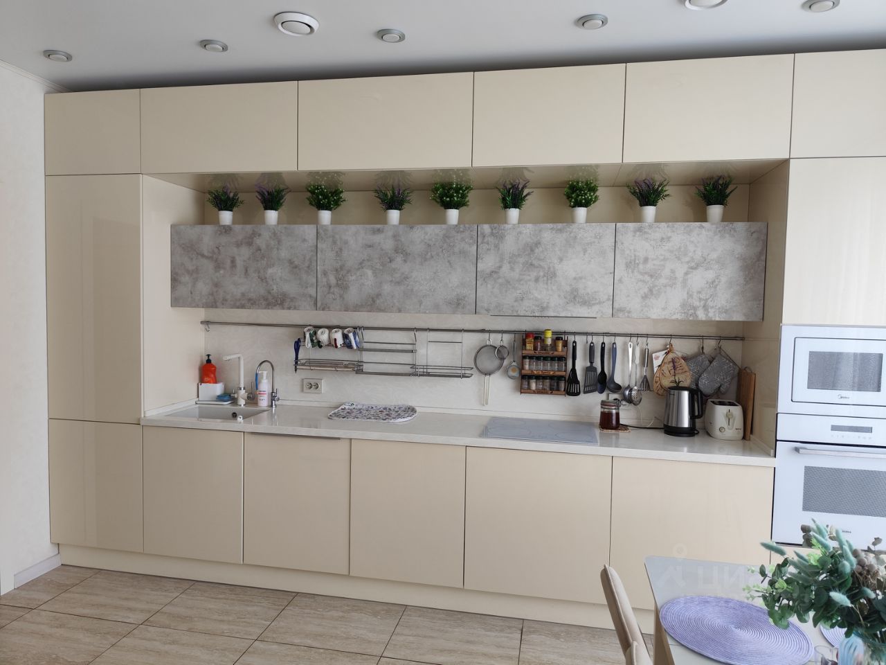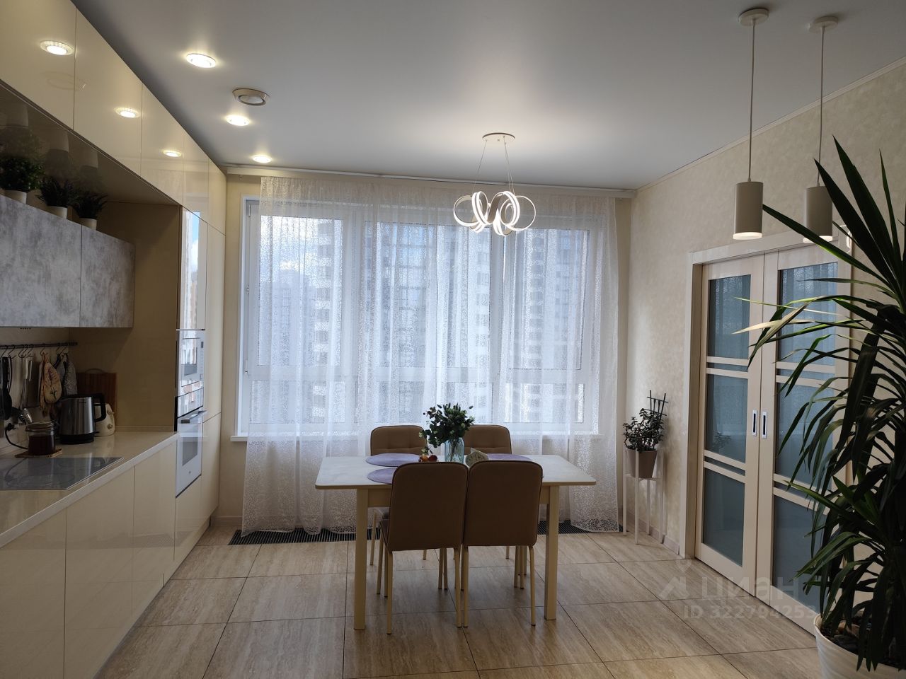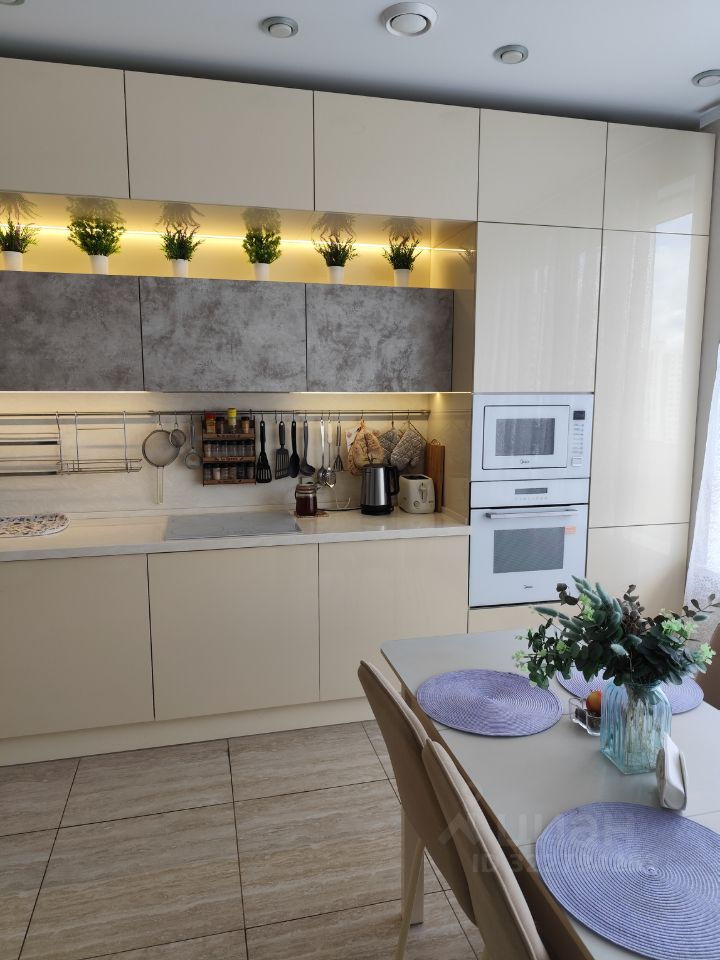 Центром квартиры является большая кухня-столовая со встроенной кухонной мебелью, изготовленной по индивидуальному дизайну (глянцевые кремовые и под бетон фасады, столешница и фартук из искусственного камня, подсветка), со встроенной техникой, с большеформатным окном во всю стену. Освещение многоуровневое: точечные светильники, люстра, подвесы, подсветка на встроенных шкафах. Из кухни два выхода в коридор и в гостиную через раздвижные двери (задвигаются в перегородку, можно кухню объединять с гостиной).