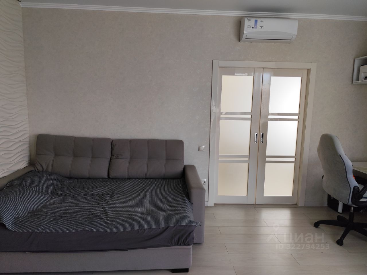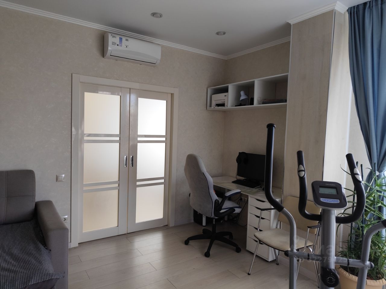 Квартира обустроена, выполнен свежий евроремонт, в отличном состоянии. Потолки- натяжные, светильники точеные и люстры светодиодные. Отделка пола - керамогранит и ламинат. Отделка стен - обои, ламинат, гипсовая плитка. В жилых комнатах установлены кондиционеры. В санузлах - электрические полотенцесушители. В спальне, детской, кухне внутрипольные конвекторы отопления. Теплый пол в санузлах, в гостиной и на лоджии.