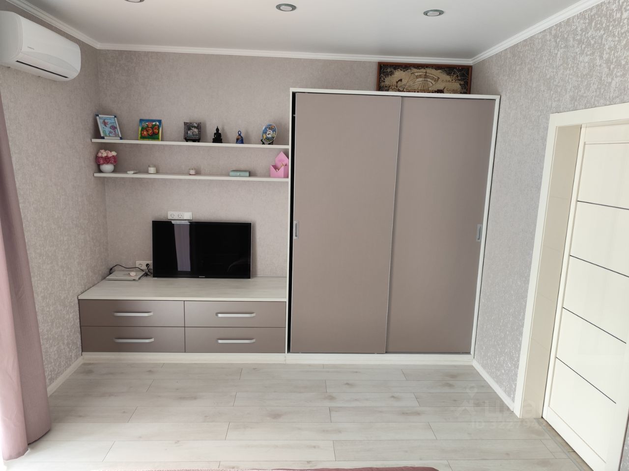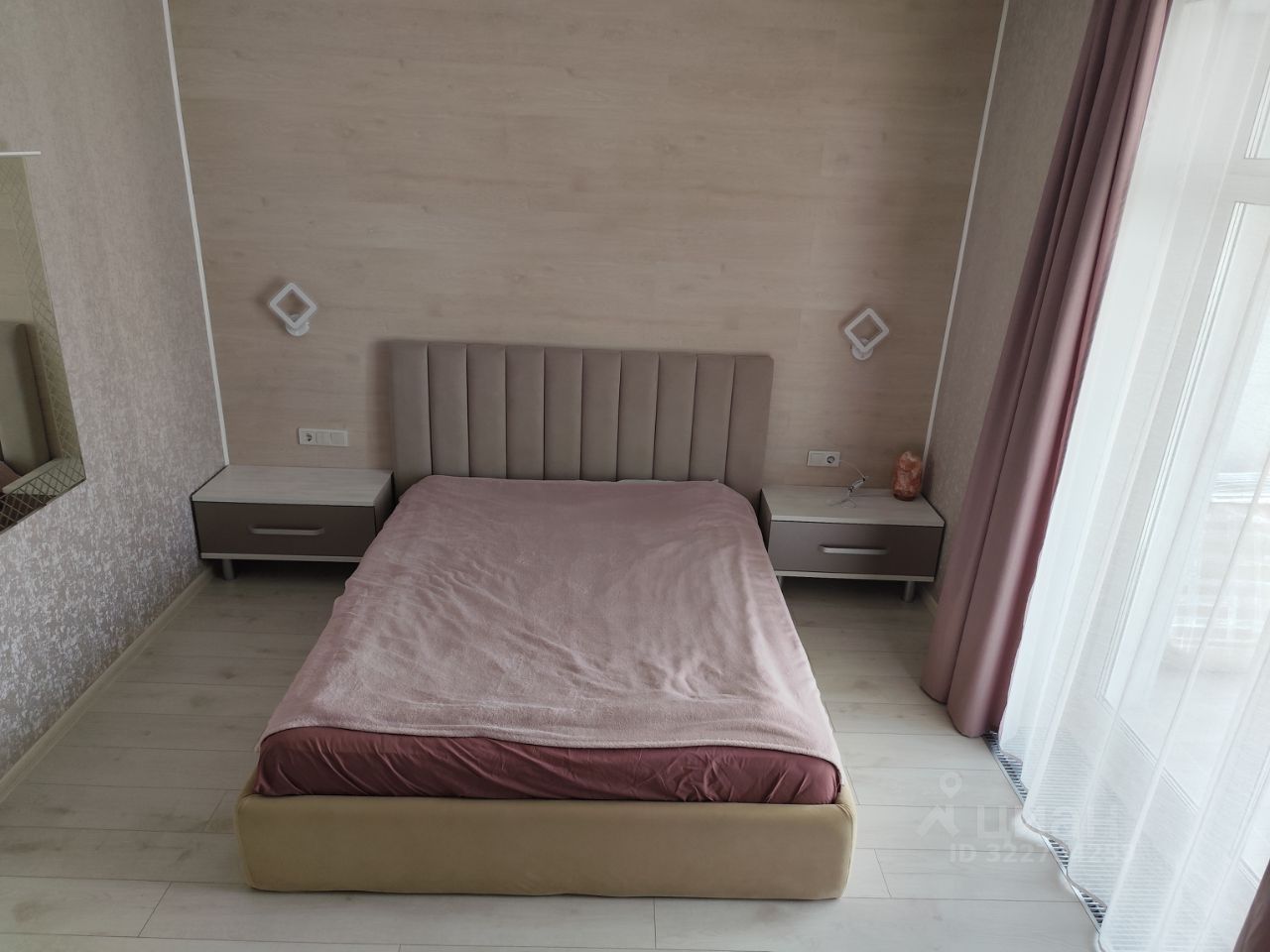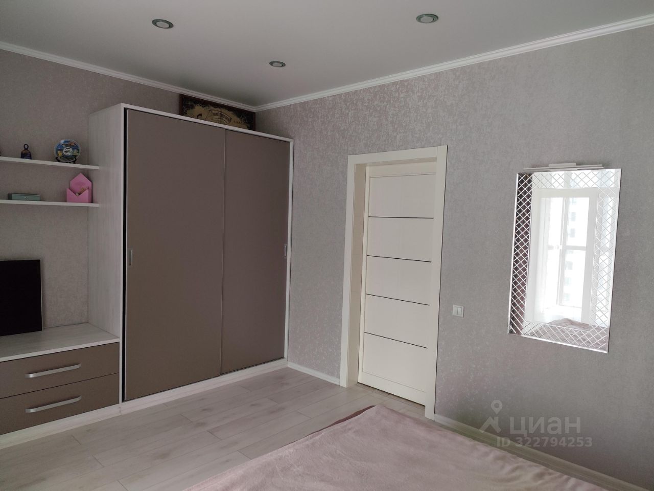 В спальне выход на остекленную лоджию . В спальне расположена двуспальная кровать, с подъемным механизмом, ортопедическим матрасом, прикроватные тумбы, комод с ящиками, полка, встроенный шкаф для одежды, зеркало с подсветкой, выведены розетки для телевизора. На лоджии кладовая для внешних блоков кондиционеров.