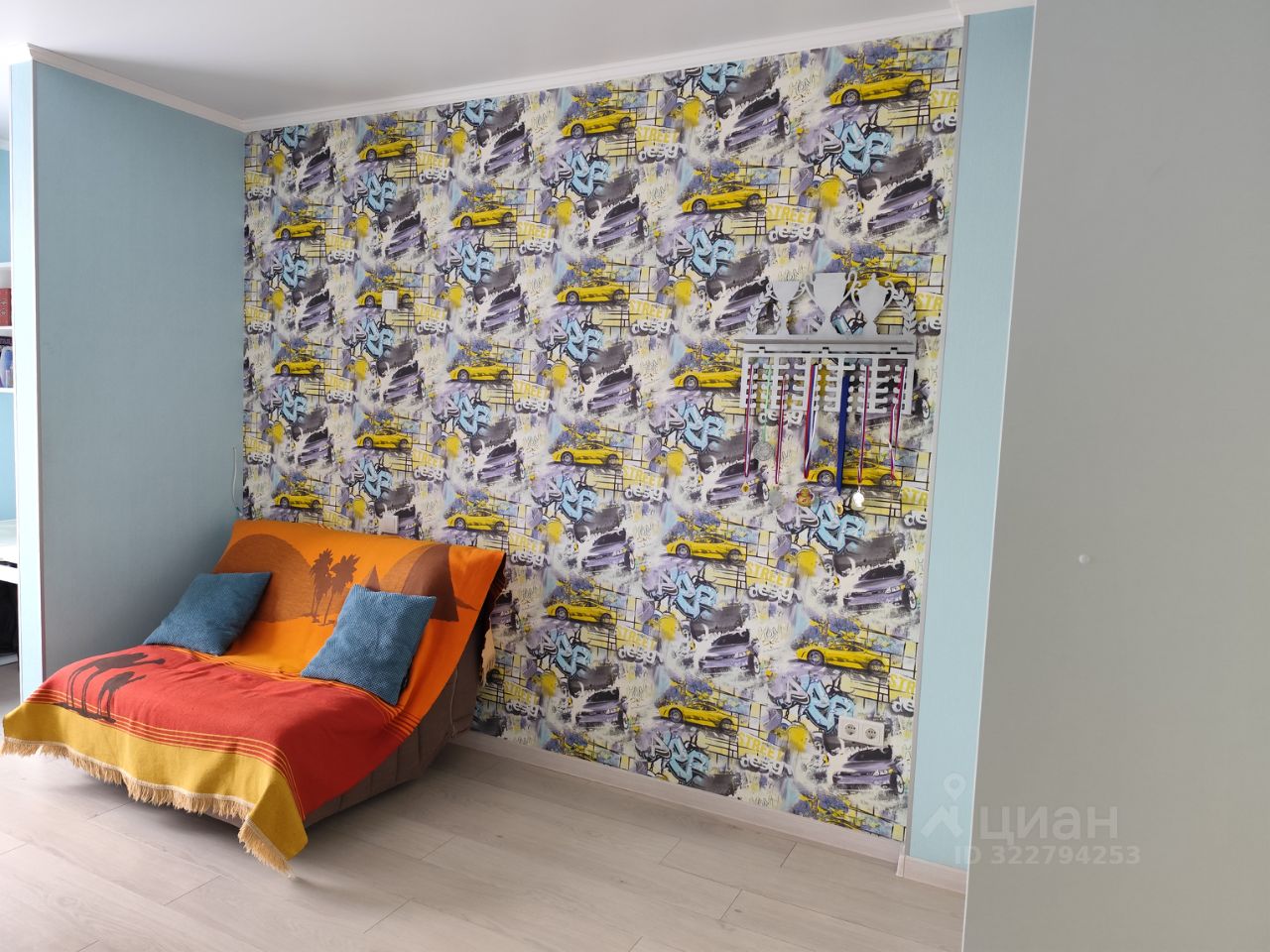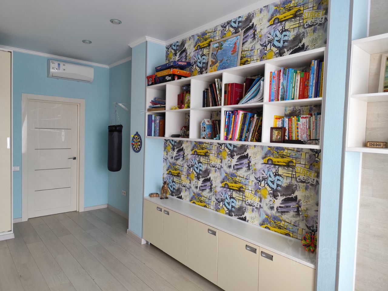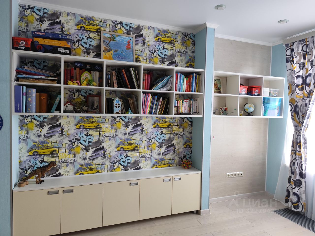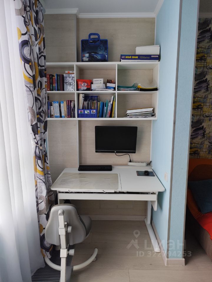 Детская комната объединена с теплой лоджией, с видом на лес. На лоджии две зоны для двух рабочих столов, в полках встроенная светодиодная подсветка; выведены розетки для компьютеров. В комнате предусмотрены встроенные полки и ящики, встроенный шкаф для одежды. Освещение точечными светильниками на разные группы выключателей.