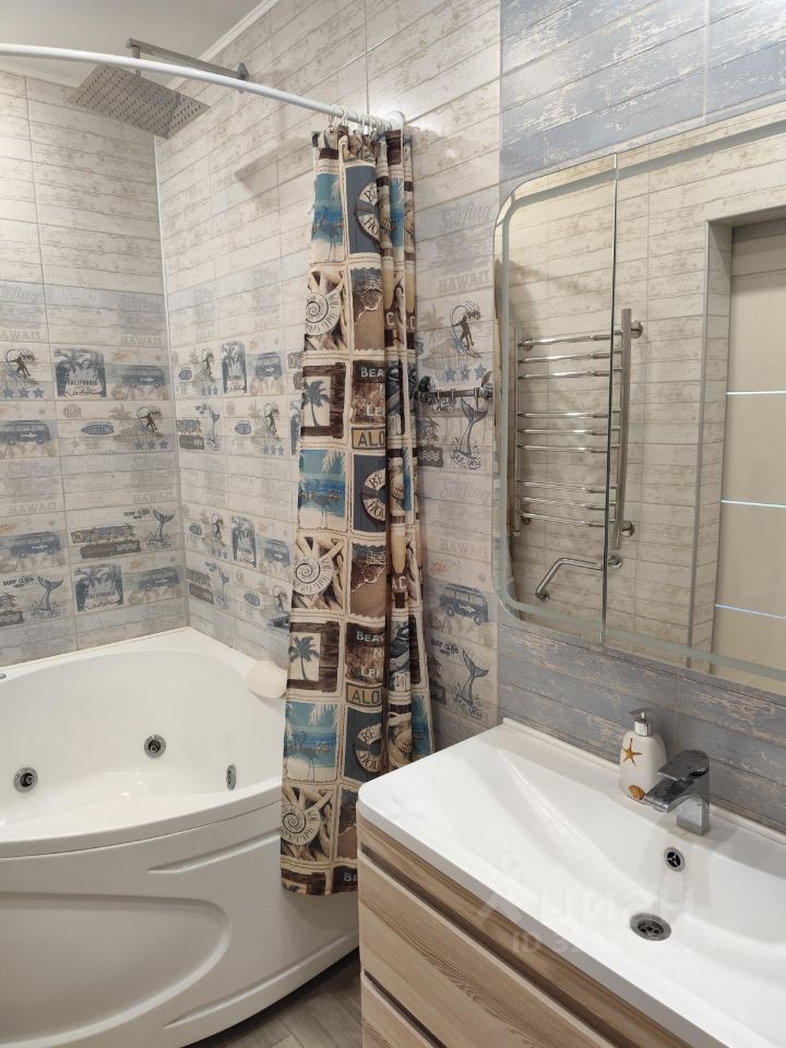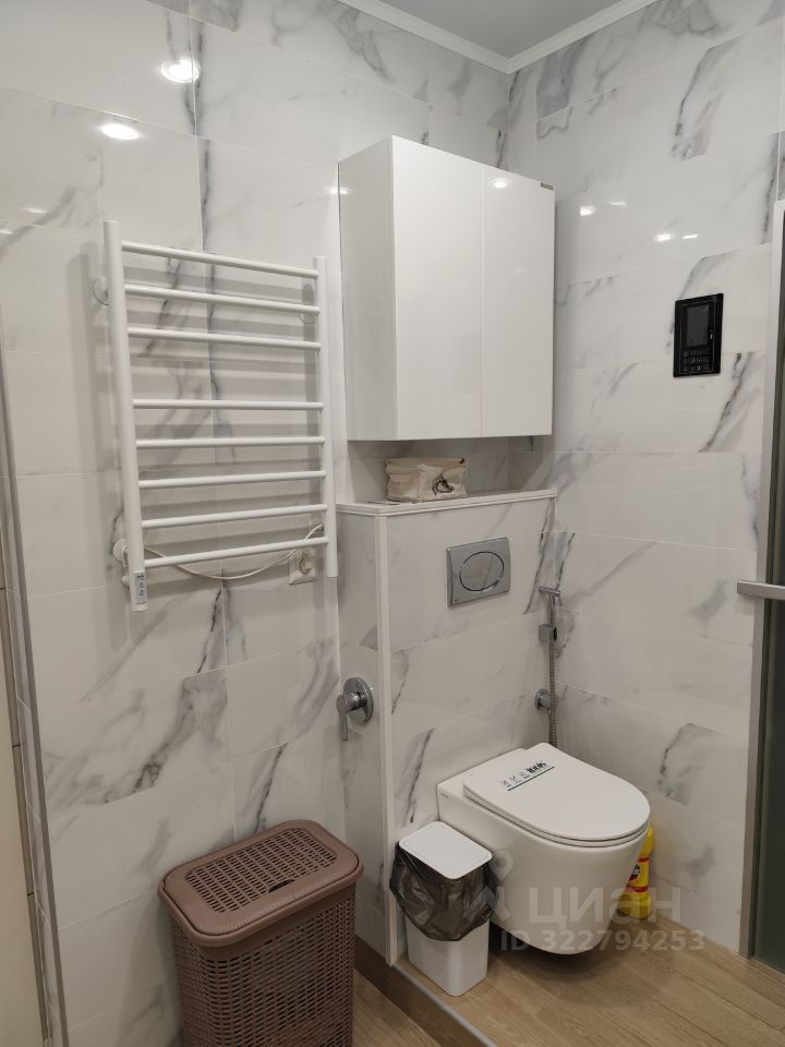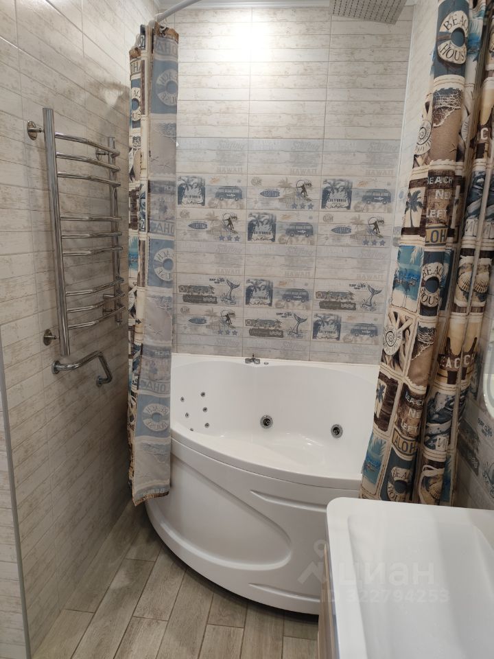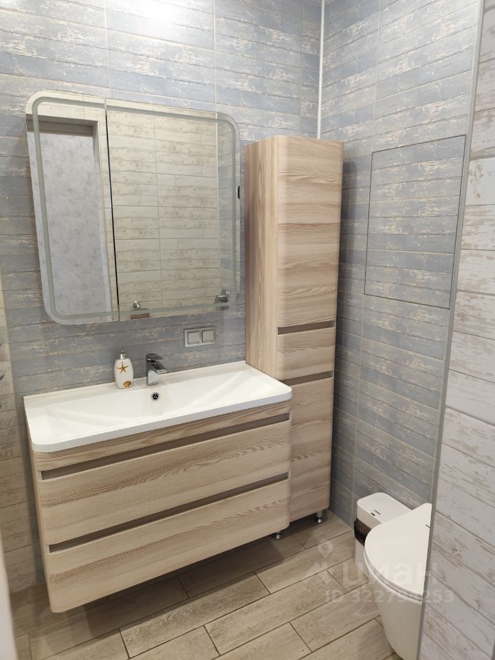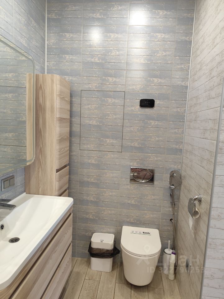 Рядом с детской располагается второй санузел с унитазом с инсталляцией, тумбой с раковиной, зеркалом, пеналом, акриловой ванной с гидромассажем и подсветкой.