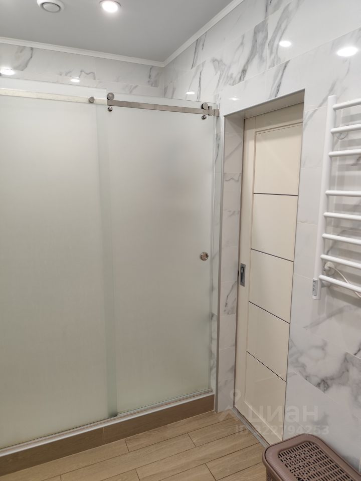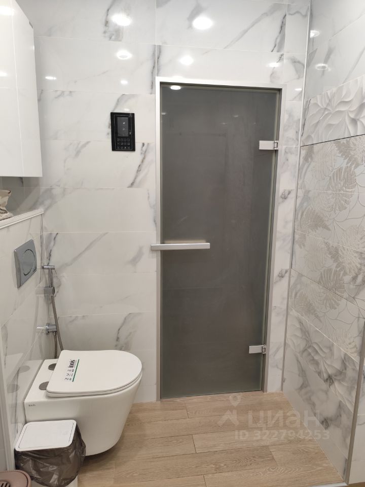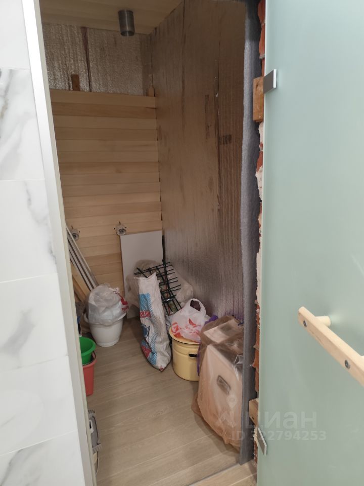 Рядом со спальней расположен санузел с унитазом с инсталляцией, шкафчиком, душевой кабиной с трапом и стеклянной перегородкой, с кладовой под сауну (есть проводка, вентиляция, отделка из каменной соли с подсветкой, отделка вагонкой, печка, камни).