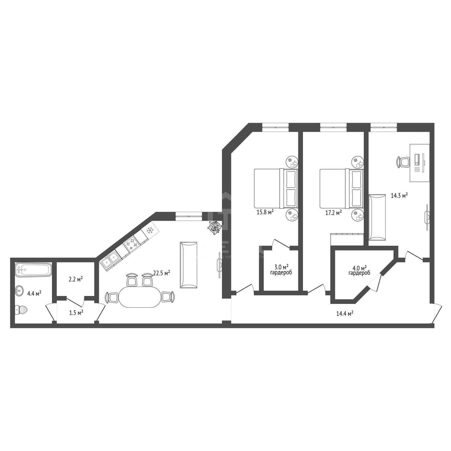 - 3 изолированные спальни + кухня-гостиная 22,5 м