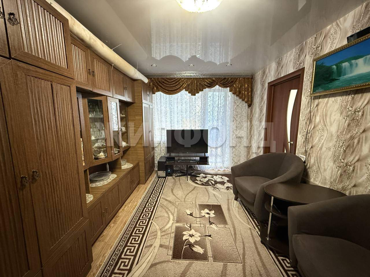 Уютная гостиная с выходом на балкон (балкон застеклен) .