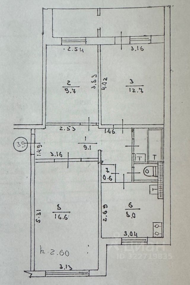 Три комнаты: 16.6 м², 12.7 м², 9.7 м², кухня - 8.0 м², коридор - 9.1 м².