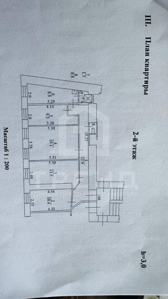 Квартира расположена на втором этаже шестиэтажного кирпичного дома 1900 года постройки. Высотные потолки в три метра придают пространству особый шарм и воздушность. Общая площадь квартиры составляет 76,2 кв. м, из которых 52,3 кв. м - жилая площадь. Комнаты изолированные, их площадь - 10,4 + 13,5 + 19,1 + 9,3 кв. м, что обеспечивает отличное зонирование пространства для всей семьи.