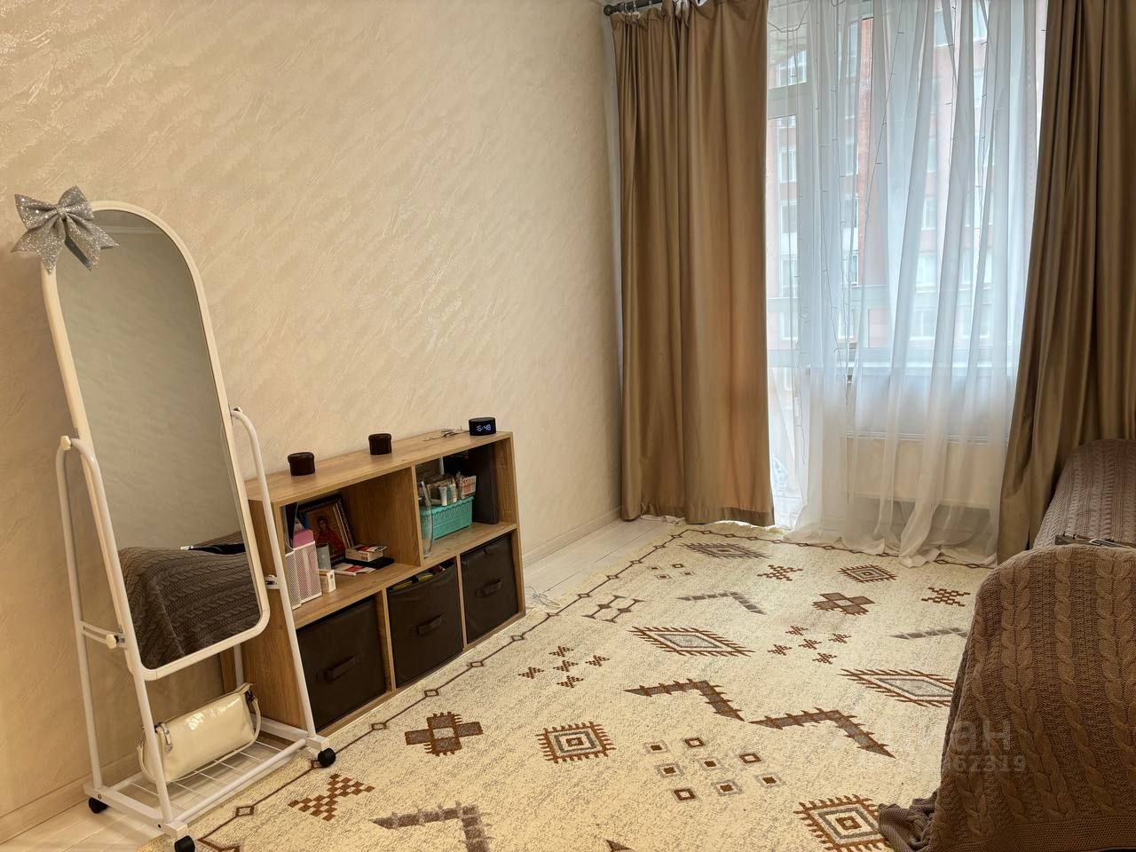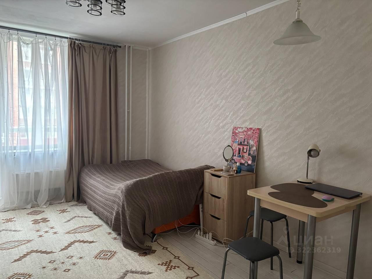 Просторная студия, выделена зона кухни, плита с духовкой, большой совмещенный санузел, застекленный балкон с французскими окнами. Kвартирa oчень тeплaя и свeтлaя, евроремонт.