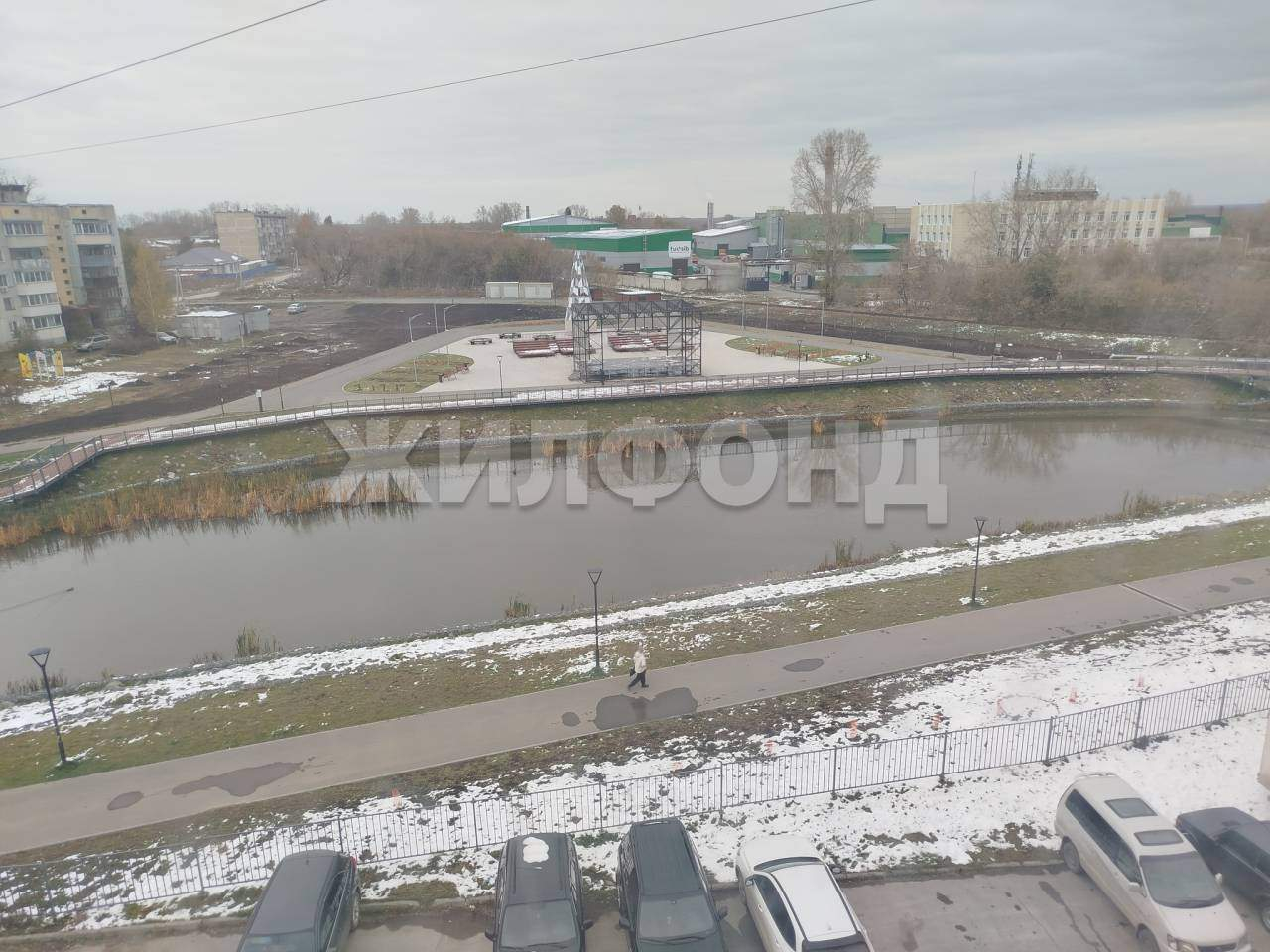 Во дворе парк с озером для прогулок.